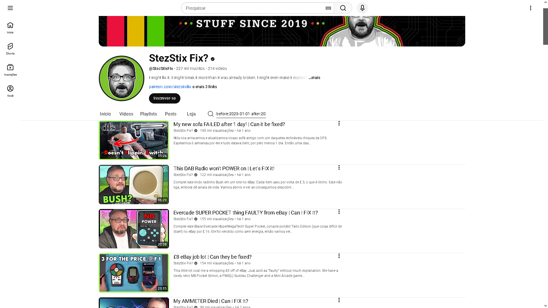 Ezemplos... funcionha direitim daí... lel~ =/https://www.youtube.com/@StezStixFix/search?query=before%3A2025-01-01%20after%3A2024-01-1