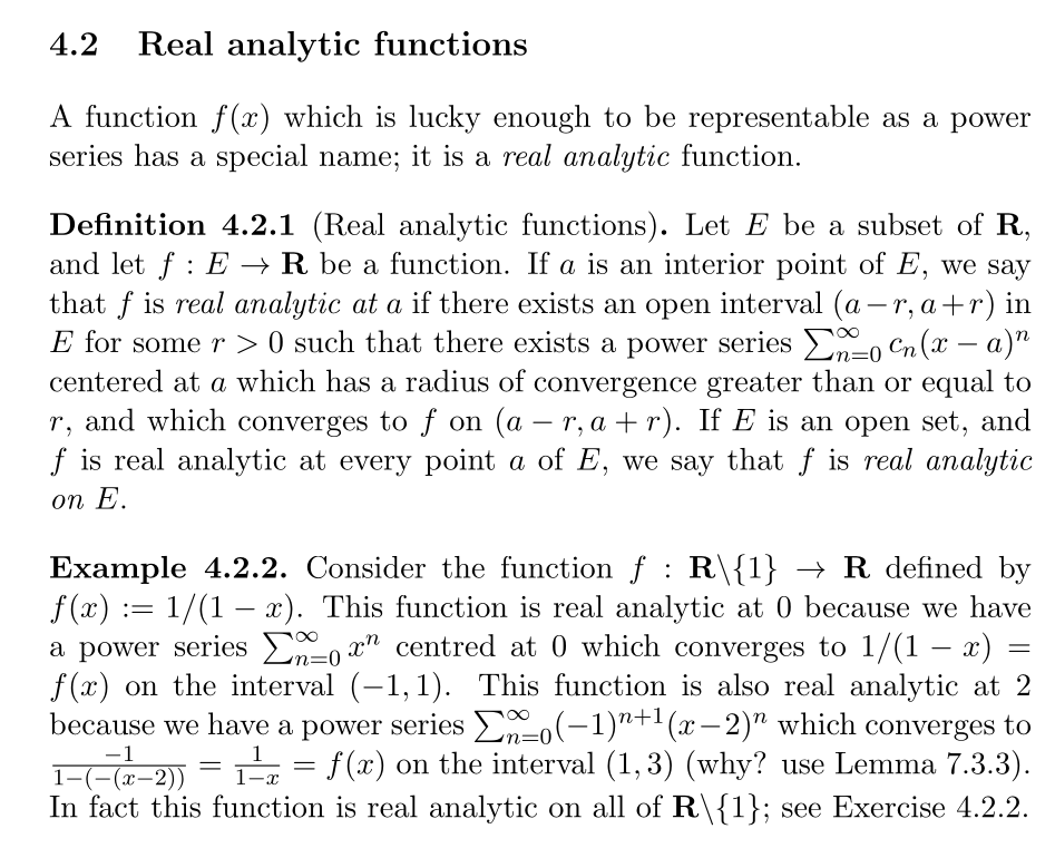 >>218718895Resumindo, são funções que são muito bem comportadas. Elas são tão bem comportadas que você consegue saber o valor delas em todos os números, estudando só como elas variam em um único número tipo 2.Sabendo como uma função bem comportada dessas tá variando quando tá chegando em 2 por exemplo, e como a variação da variação etc dela é em 2... Por ela ser tão bem comportada, você consegue saber o valor dela pra todos os outros números 3, 4, 5, -10, -2.5. :/Basta estudar ela em 1 número pra saber o comportamento dela em todos os números. :/Exemplos: função seno, cosseno...