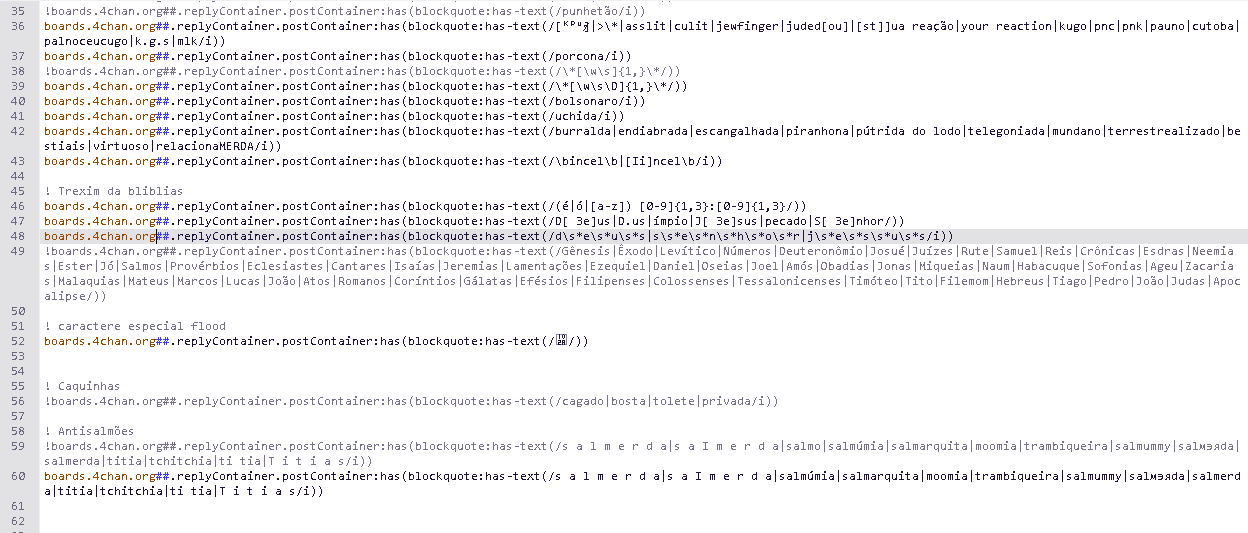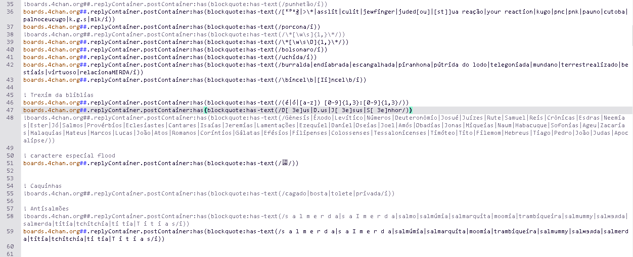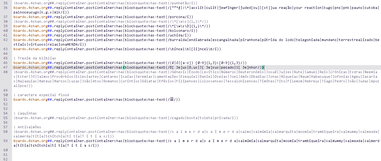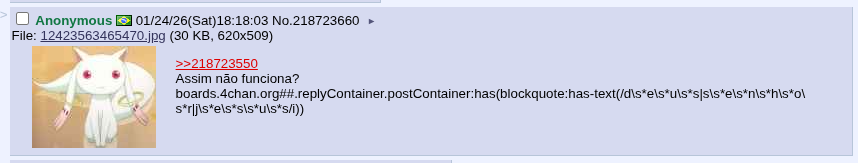 >>218723550Assim não funciona?boards.4chan.org##.replyContainer.postContainer:has(blockquote:has-text(/d\s*e\s*u\s*s|s\s*e\s*n\s*h\s*o\s*r|j\s*e\s*s\s*u\s*s/i))