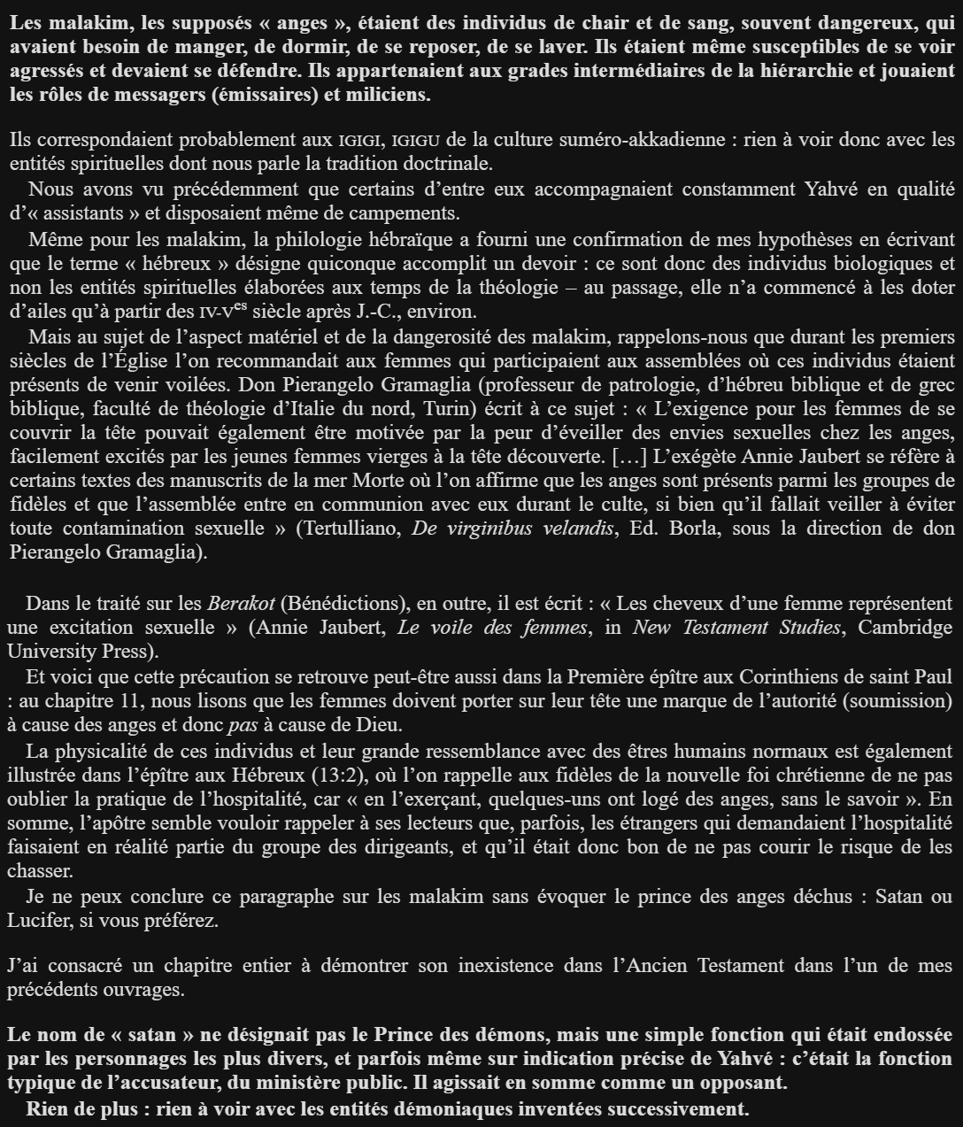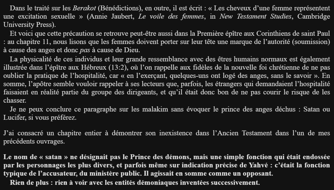 >>218741027dans les textes originaux (le codex de leningrad, écrit en ancien hébreux) diable est une fonction et pas une entité, les elohim sont de « simples » (quoique probablement d'origine extraterrestre) chefs de guerre (et pas des dieux, ils ne sont pas omniscients, n'ont pas créé l'univers etc) et les anges sont de simples messagers de ces chefs (ils n'ont pas d'ailes, ne mesurent pas plusieurs milliers de kilomètres etc)les traducteurs ont transformé des récits simples et cohérents en récits fantastiques, surnaturels et absurdes