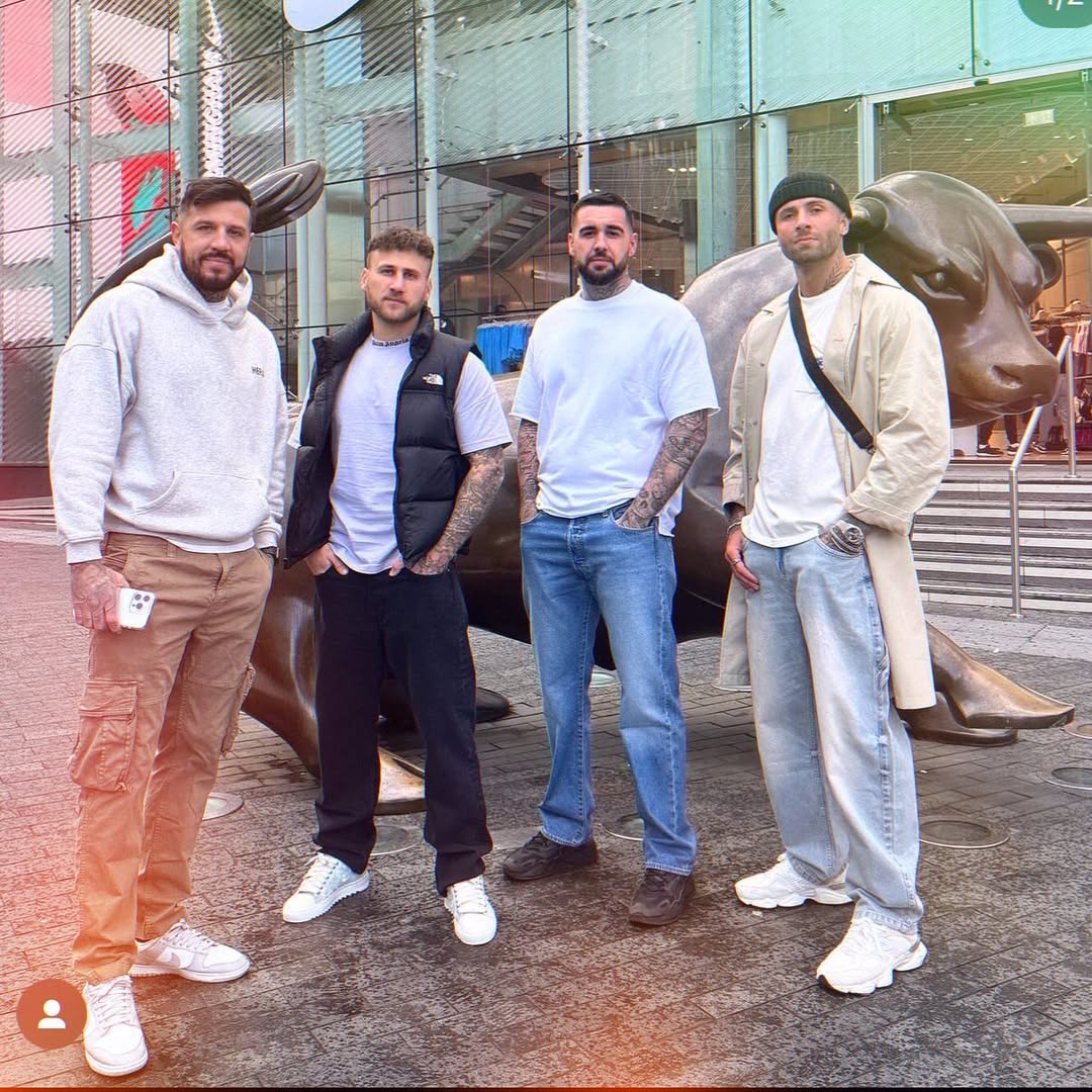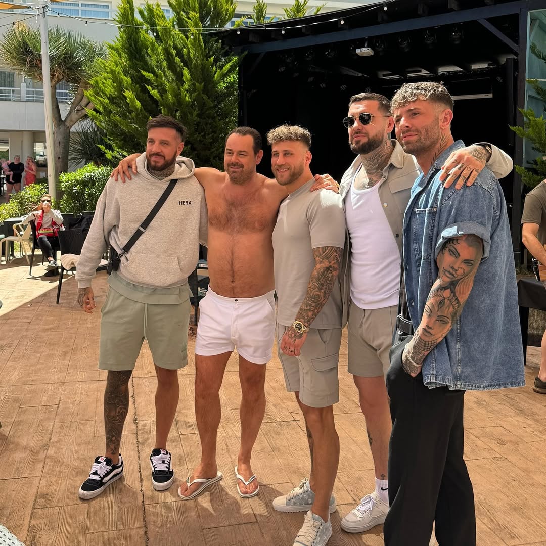 danny dyer posing for a picture with those four lads who wore tight jeans