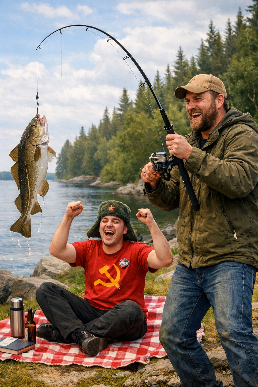 >rorke catching a cod on the end of his tackleleftypol sitting on the picnic blanket cheering him on