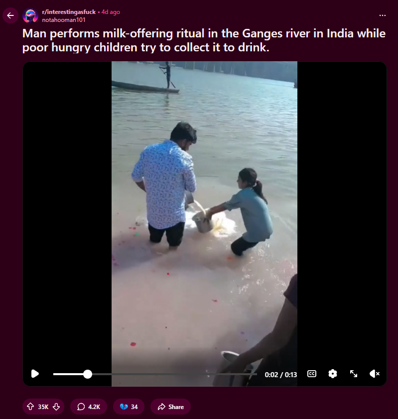 >>218756099Milk doesn't fill up your stomach and doesn't make you less hungry, it could be spoilt milk, maybe some Brahmin told him to do it for good fortune, maybe he just didn't want to give the milk to them. Regardless, I wish he'd given thr milk to thr kids, this pollutes the river.>>218760021I never understood why that never worked, looks to me like they never really converted, just did the fancy conversion ceremony. Why do they need to go to Hindu temples now if they're Buddhists and why do they claim low caste status if they're not part of the caste hierarchy at all? Seems like a thinly veiled conspiracy against upper castes.