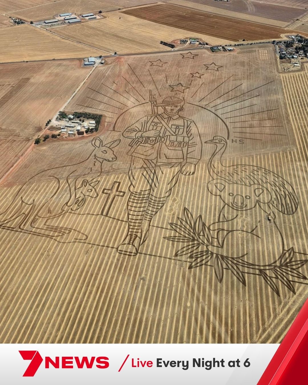 SA farmer and proud Aussie, Harrison Schuster, has used his 300-acre paddock in Freeling as a canvas, turning it into a masterpiece to celebrate Australia Day.The tribute features iconic native animals and an Anzac soldier.