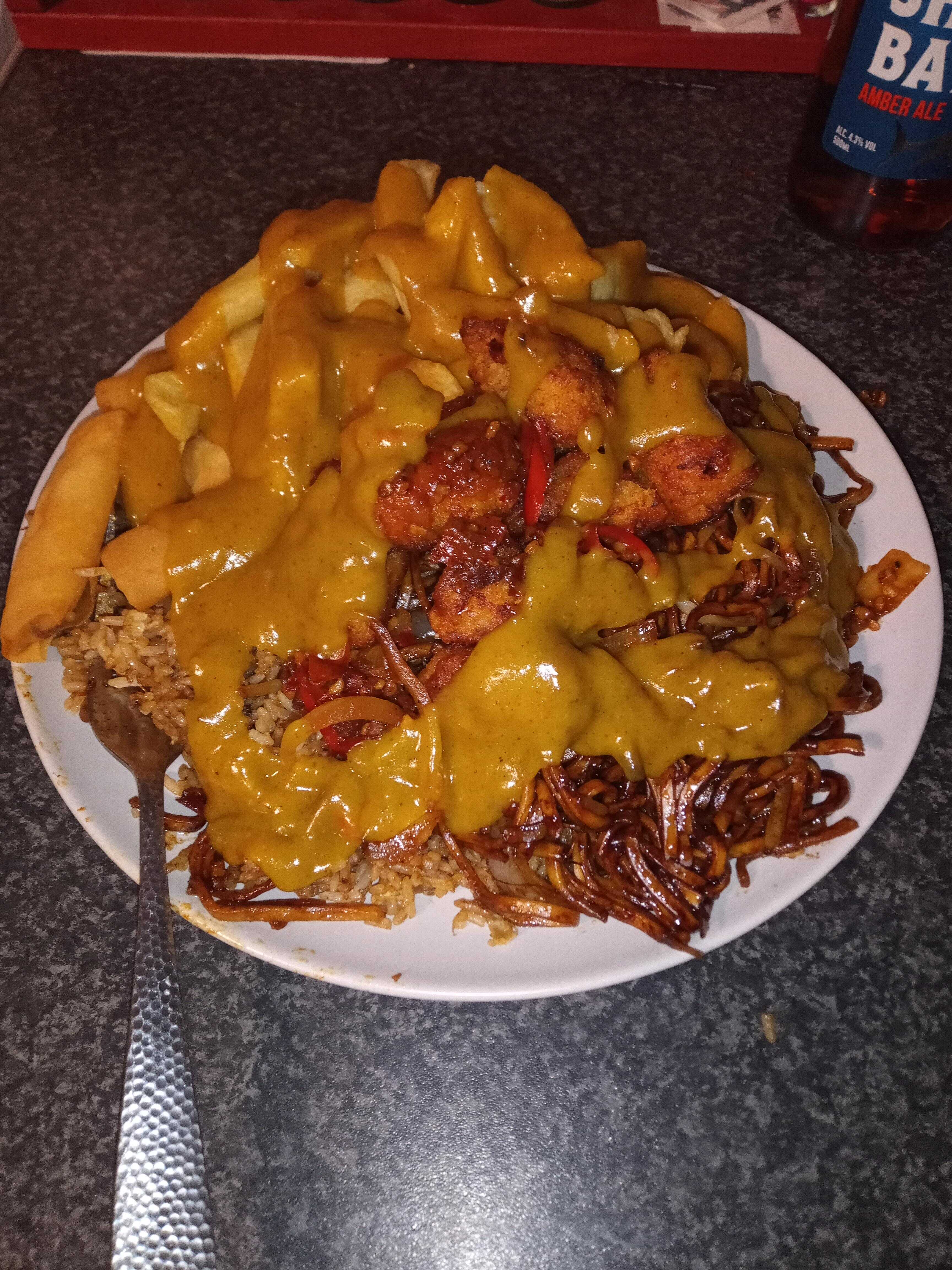 What is the lore behind british style ”””””chinese””””” food? Because how the fuck, does barbeque chicken, fried dough, wheat noodles, french fries, nasigoreng, topped with curry sauce, constitute anythin even resembling chinese cuisine?