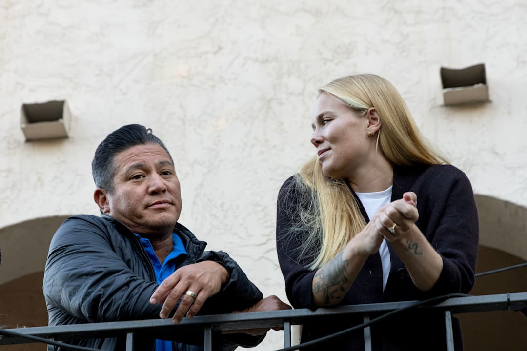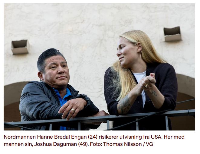 >Nordmannen Hanne Bredal Engan (24) risikerer utvisning fra USA. Her med mannen sin, Joshua Daguman (49)