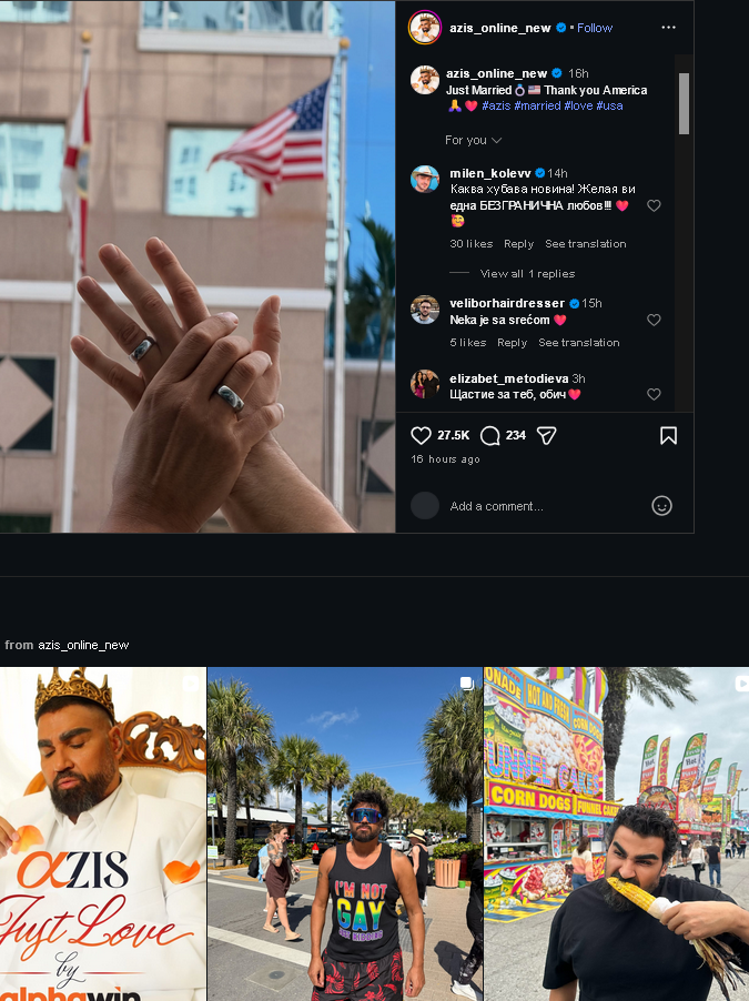 >Pop-folk singer Azis got married in the US>However, it is not clear who his partner is. The only thing the performer shared a few days ago on social media is that the man next to him is a surgeon, an American, and a "dream husband."
