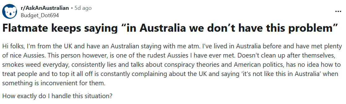 >hi folks i’ve met an asshole from another country and because i’m a normgroid piece of filth i’ve decided to solicit advice on how to deal with this person from strangers on reddit also from their country