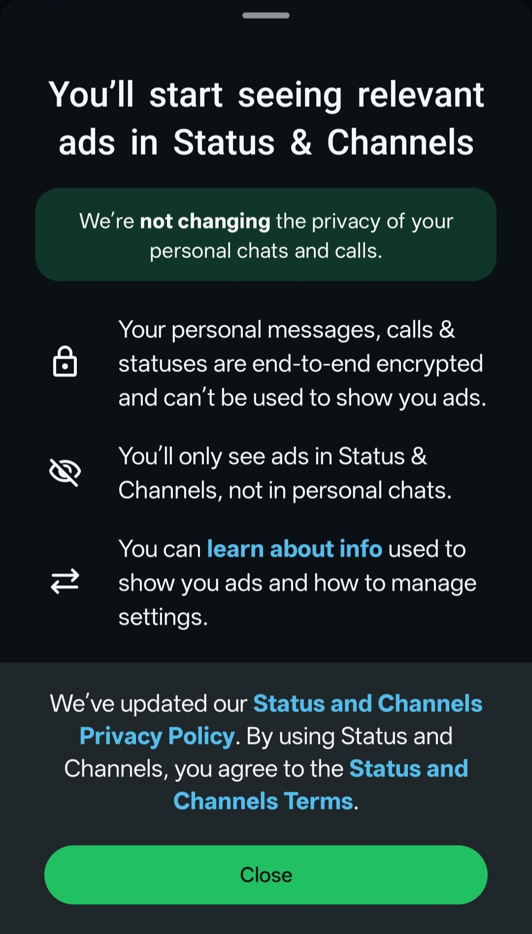 >status>channelsI don't use them, Whatsapp is an instant messaging platform that I use for instant messaging.Reject, ignore and avoid all its social-media-like features.