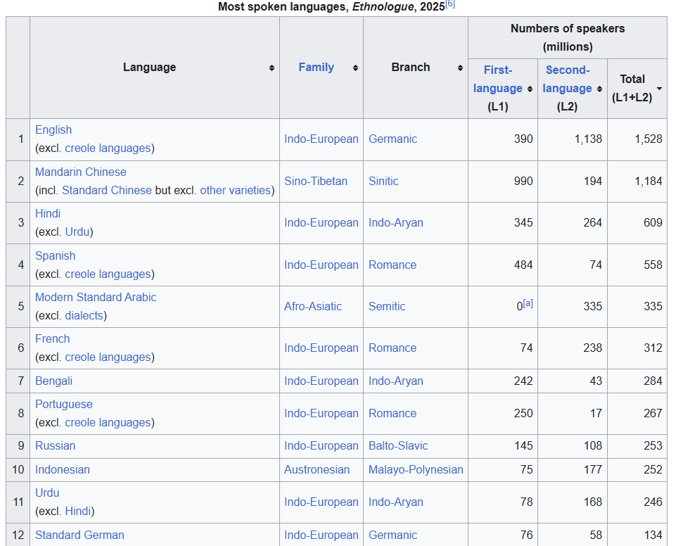 >>218820541Presumably they're not counting English, Spanish, French, or Portuguese because the majority of their speakers are outside Europe. (I don't know about the exact distribution of Russian but most of Russia is in Asia, at least, and a lot of the non-native speakers will be in Central Asia.)