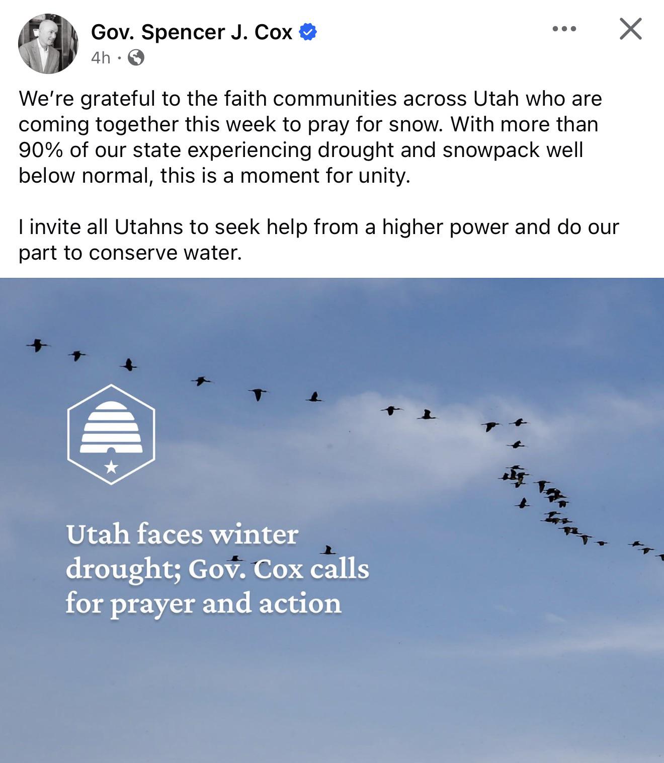 Because we're prayer warriors unlike Europe. In my state we've had the warmest winter on record. We usually have feet upon feet of snow but SLC has no snow and Park City has no snow. We usually have "the best snow on earth" but our Great Salt Lake which creates the lake-snow effect, is drying up because of our alfalfa industry.That's where the prayer warriors came in. In America, we solve problems via prayer... not "science" or any of that bullpoop.In your country do you have prayer warrior squads? In your country do you use the power of prayer often?
