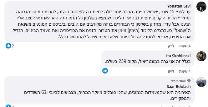 >העיר הלא שווייצרית הראשונה ברשימה היא ניו יורק בארה"ב, השנייה היא ריקיוויק האיסלנדית, הונולולו שבהוואי וסן פרנסיסקו הקליפורנית בהמשך ואז... תל אביב שלנו. במקום ה-24 בעולם נמצאת רמת גן ובמקום ה-26 ירושלים. כאשר חיפה במקום ה-34 פתח תקווה במקום ה-49 (מעל אוקספורד הבריטית מכל המקומות בעולם!) ובאר שבע, בירת הנגב, במקום ה-54, ממש מקום מתחת לשיקגו.5 ערים ישראליות ברשימת 60 הערים היקרות בעולם - כאשר רובן ככולן ממערב או צפון אירופה וארה"ב. עכשיו תקראו לי עוכר ישראל אבל אין מצב שחיפה היא עיר שטוב יותר לחיות בה מאשר הארלם, פרבר ציורי של אמסטרדם (מקום 37). אני מתקשה להאמין שבבאר שבע יש איכות חיים טובה יותר מאשר דנבר (מקום 61), ברייטון (64), הלסינקי (65) או וינה (69).אבל לפי המספרים האובייקטיביים יקר יותר לחיות בבאר שבע או פתח תקווה מאשר פרנקפורקט, מילאנו, מלבורן, אוסטין או ונקובר.ובישראל לא יקר בגלל שיש רגולציה שמחייבת את מקדונלד'ס להשתמש אך ורק בפרודוקטים מקומיים מעל איכות מסוימת כמו בשווייץ. כאן בישראל יקר כל כך בגלל מחירי דיור ומזון גבוהים ב-30%-50% מהממוצע ב-OECD, שכר נמוך יחסית לפריון, וריכוזיות בשוקי המזון והשירותים.https://www.fb.com/share/p/1FNKr8QWW9/עכשיו זה רשמיפתח תקווה יותר יקרה מפרנקפורט
