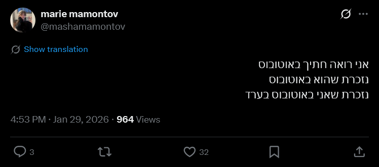 >>218851085מהסוג שיורדת מהאוטובוס בשביל לא לעמוד ליד כבודו