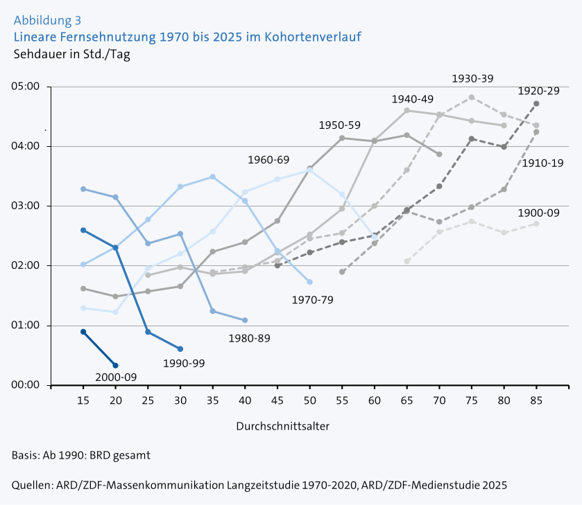 >>218847007Jede Linie stellt eine Geburtenjahrgangskohorte dar.Von links nach rechts werden sie älter.Deine Kohorte ist vermutlich die, die aktuell bei etwa 15 Minuten linearem Fernsehkonsum am Tag ist.