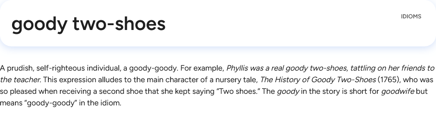 >>218860412>good-two-shoesKek I love english idioms. Dictionary tells me it's goody two shoes though, so perhaps good two shoes means something else? Also, still kept the oath of ancients fr fr.>>218860554https://www.youtube.com/watch?v=DlOzvcsEGUs
