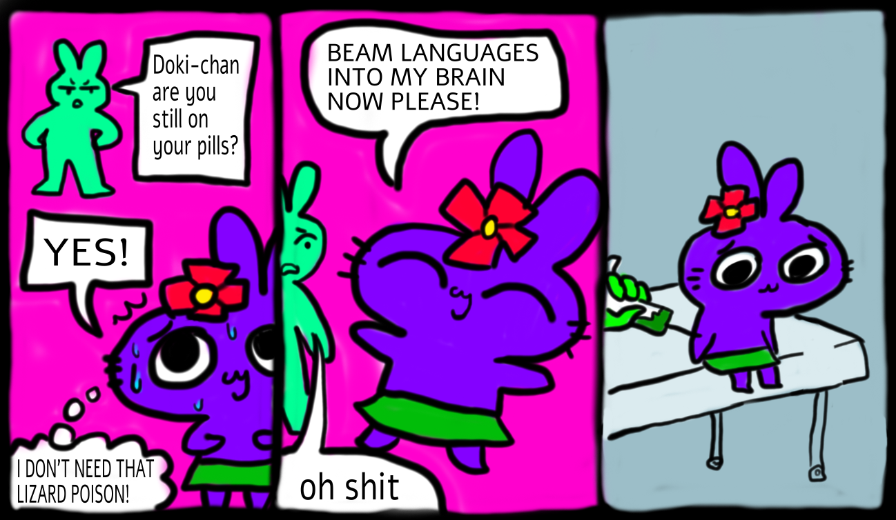 Day 2192:Patient still believes he will some day learn a language despite making zero progress in years. Increasing dosage of anti-psychotics. If this state persists, the team will soon employ daily sessions of electroshock therapy.