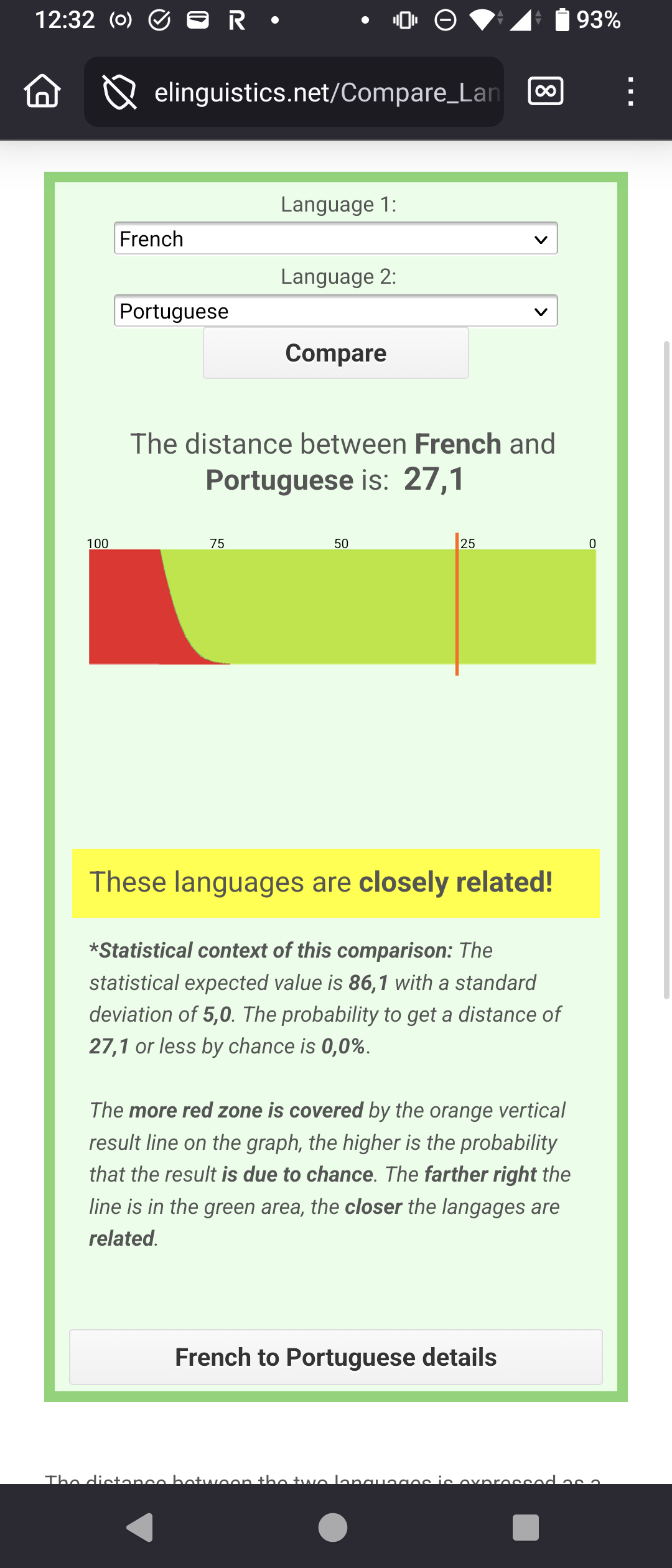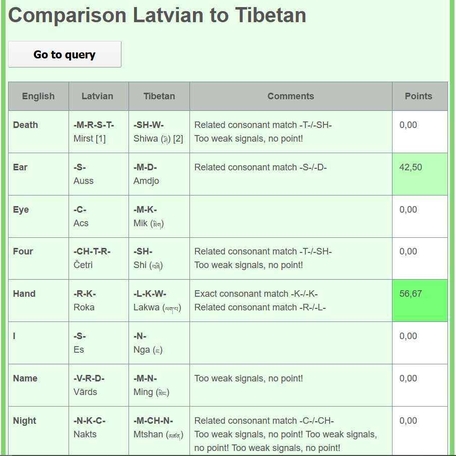 >>218929415Tested with Lithuanian, interesting observation I saw was how Slavic languages were often times on the verge of the "closely related" range, with some (e.g. Czech, Russian, Croatian) falling just outside of it, and other barely getting in (e.g. Polish, Ukrainian, Serbian).Funnily, Latin had a closer distance to Lithuanian (39.7) than any of the Slavic languages I tested. The closest distance was with Prussian (25.0), and after checking the details, I can say that there's some bullshit going on kek (e.g. Aulaūtwei and Mirti are apparently closely related, giving about 57 points, but Rānkā and Ranka are apparently worth only 66 points, and the clearly related "Undan" and "Vanduo" get a total of 0 points).No Latgalian or Samogitian, unfortunately.>>218950386You can see what words are being compared to eхactly by scrolling down a bit and clicking the details button (see also picrel).According to the footnotes, it sources all of its Tibetian words from "MALHERBE, Michel. Les langages de l'humanité Paris : Robert Laffont, 1995. ISBN : 2-221-05947-6, p. 1596 – 1599 and en.wiktionary.org/wiki/Appendix:Tibeto-Burman_Swadesh_lists "