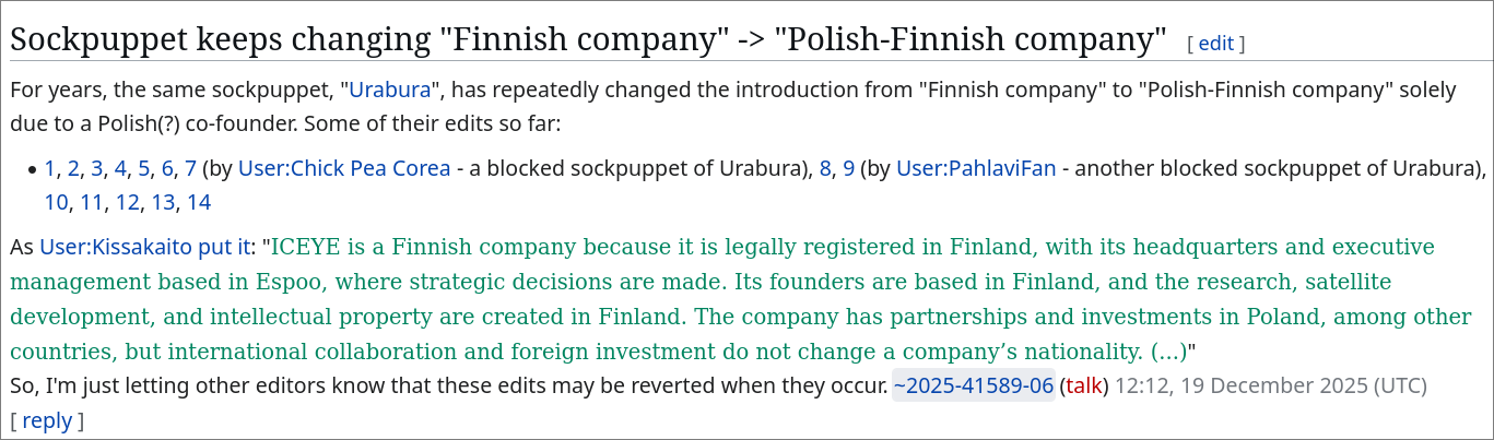 >be Polish>see Iceye, a Finnish startup that became one of the largest satellite firms in the world>make bunch of sockpuppet accounts on wikipedia to change it to a "POLISH-Finnish" company solely because the CEO is PolishPoland...pls. I am asking you nicely to stop. This is very important for us.