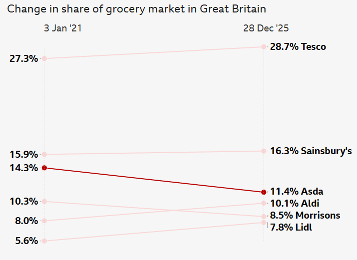 >>218913409Asda's market share fell from 14.3% (2021) to 11.4% (late 2025), driven by three major issues: Debt and Underinvestment: A £6.8bn debt-financed buyout in 2021 created a £3.8bn net debt burden. This limited investment, degrading store standards and strategic flexibility. IT and Operational Meltdown: A poorly executed £1bn IT migration caused empty shelves, online order failures, and payroll errors, directly losing customers. Loss of Competitive Edge: Underinvestment and inconsistent strategy eroded its "cheapest" reputation against Aldi/Lidl, while rivals like Tesco built stronger value perceptions with loyalty schemes.Asda's turnaround plan is high-risk, requiring massive price investment while managing its heavy debt.