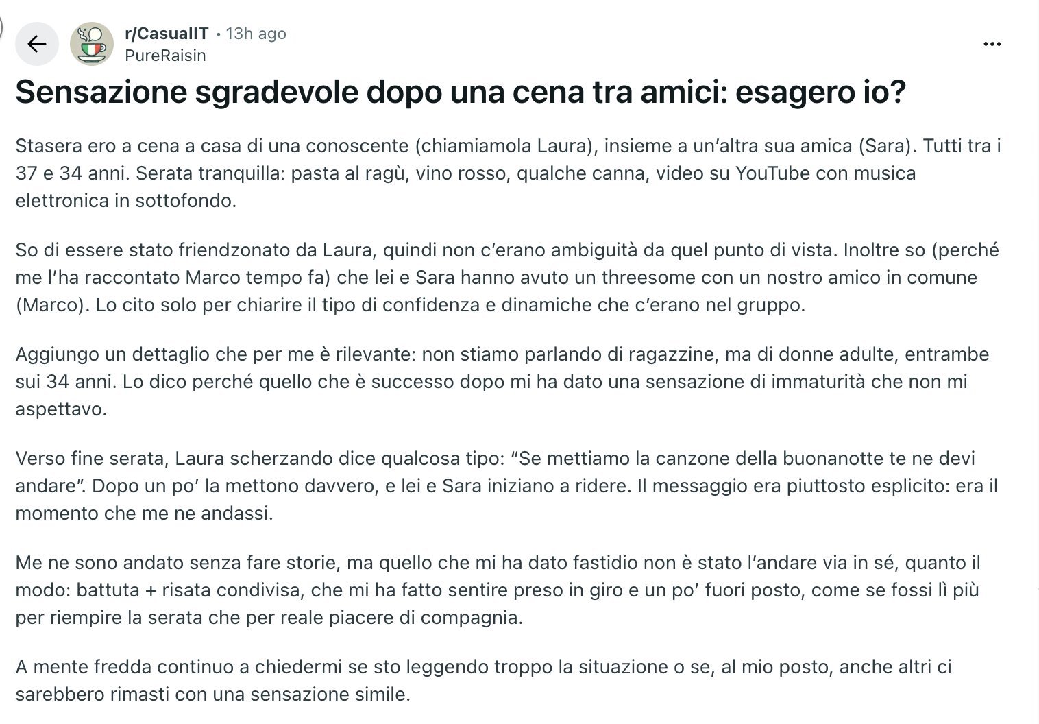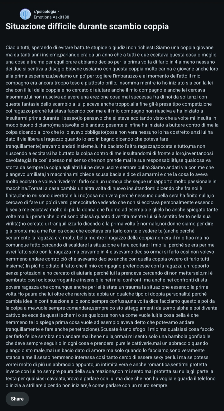 questo è il mio cuckpost preferito, non tanto per il contenuto del thread ma per i commenti che fingono che sia tutto perfettamente normale https://www.reddit.com/r/psicologia/comments/1irq780/tipa_mi_dice_che_ha_partecipato_a_unorgia_non_so/>Sul divano, parlando, se ne esce inizialmente con “ma non ti sei mai baciato con un tuo amico?” “beh, no…” “non sai cosa si prova, però, potrebbe piacerti” “mah, sono sicuro della mia eterosessualità, non ho bisogno di conferme, tipo ficcare la lingua in gola ai miei amici” “io ci ho provato, con le mie amiche” “e? …” “e niente, non mi è piaciuto, ci siamo messe a ridere” Ok, fino a qui non mi ero ancora scandalizzato, siamo pur sempre nel 2025. Proseguendo si finisce a parlare delle nostre rispettive relazioni, qui mi confessa che durante un’uscita a 4 (due coppie) si è finiti a scopare con i partner altrui. Andando ancora avanti, mi confessa che, durante l’università, ha partecipato a un’orgia. Io, tra lo stupito, il “deluso” e il curioso, ho cercato di chiederle il motivo per il quale lo avesse fatto. Lei non mi ha risposto chiaramente, sembrava tra l’ironico e l’imbarazzato. Dopo queste confessioni, sinceramente, mi è scesa un po’. Lei mi piace, ma davanti a questi racconti resto a metà tra il basito e lo stupito. Dovevo confessarlo a qualcuno.