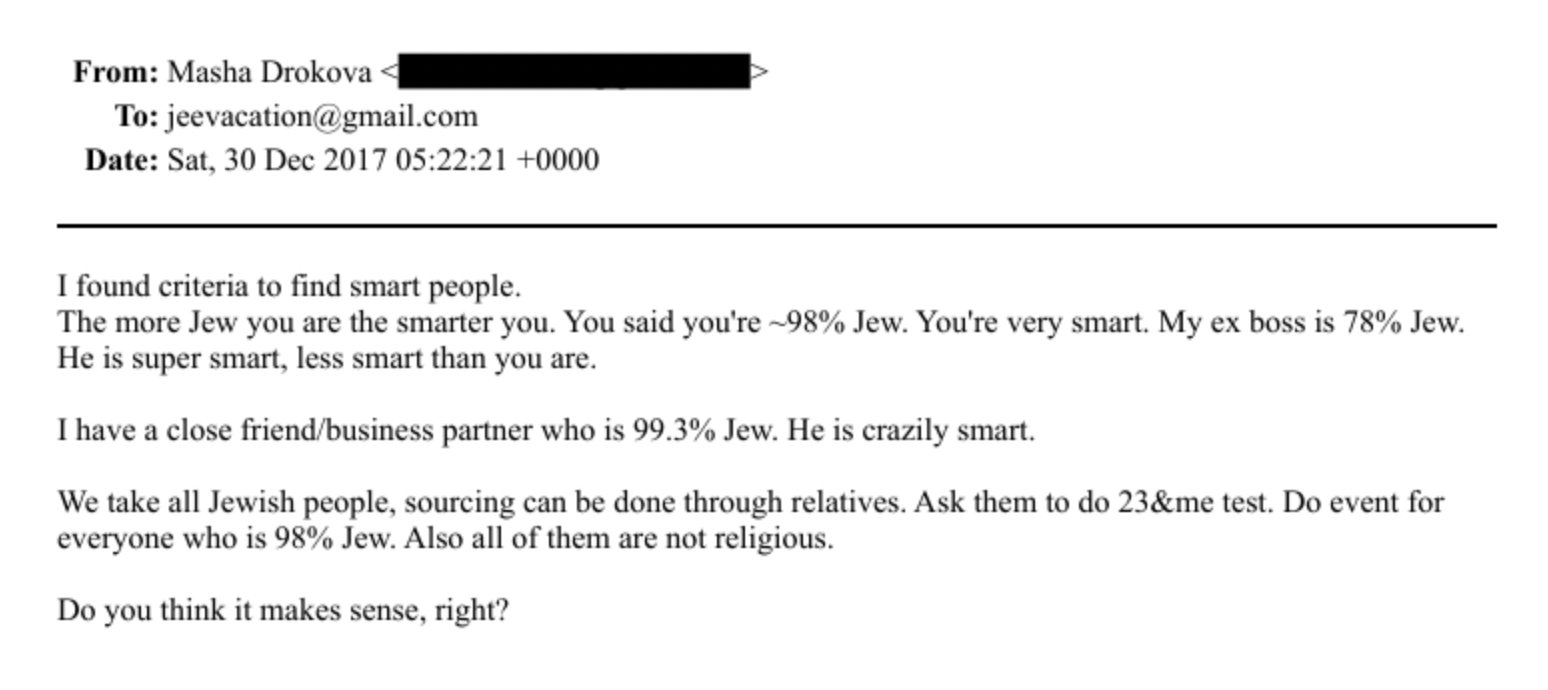 "I found criteria to find smart people. The more Jew you are the smarter you. You said you're 98% Jew. You're very smart. My ex boss is 78% Jew. He is super smart, less smart than you are.I have a close friend/business partner who is 99.3% Jew. He is crazily smart. We take all Jewish people, sourcing can be done through relatives. Ask them to do 23&me test. Do event for everyone who is 98% Jew. Also all of them are not religious."https://www.justice.gov/epstein/files/DataSet%209/EFTA00935512.pdf