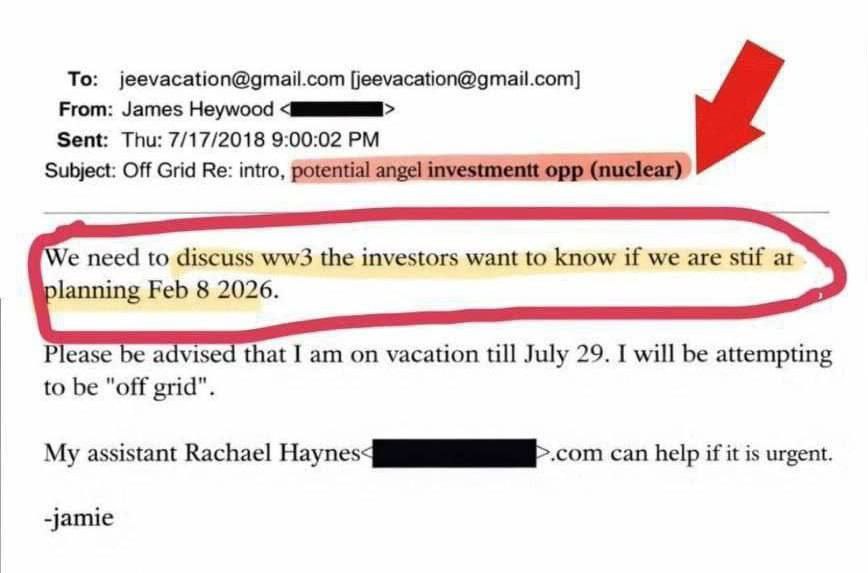 הקבצים של אפשטיין מכילים אזכורים של משקיעים מסוימים המתכננים לדון באפשרות של תחילת מלחמת העולם השלישית ב-8 בפברואר 2026.