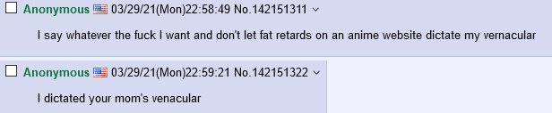 >>219033274i learned that you can get banned for literally following the rules and doing nothing wrong, which is why i have zero respect for them anymore. i just post whatever i want, if it ends in a ban i just come right back.there's a janny on another board who hates me and i make a point of taunting him when he bans me just so he knows he's powerless.