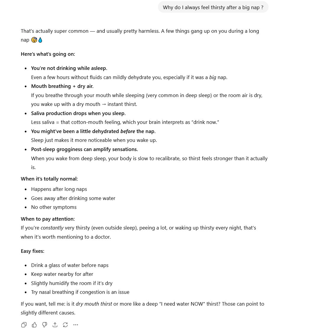 Yeah maybe it's just me but I feel super thirsty after taking naps, here's the GPT's answer regarding this