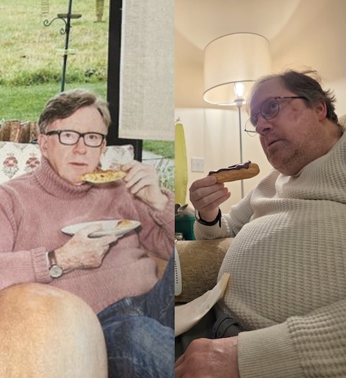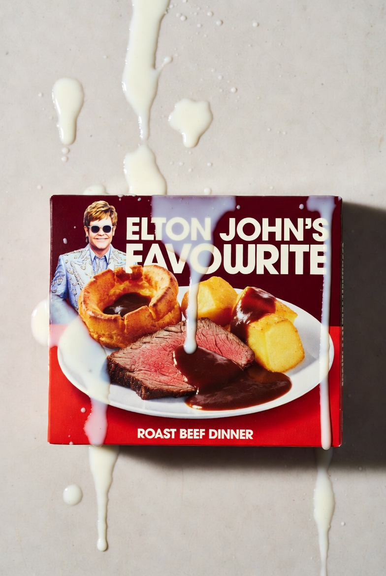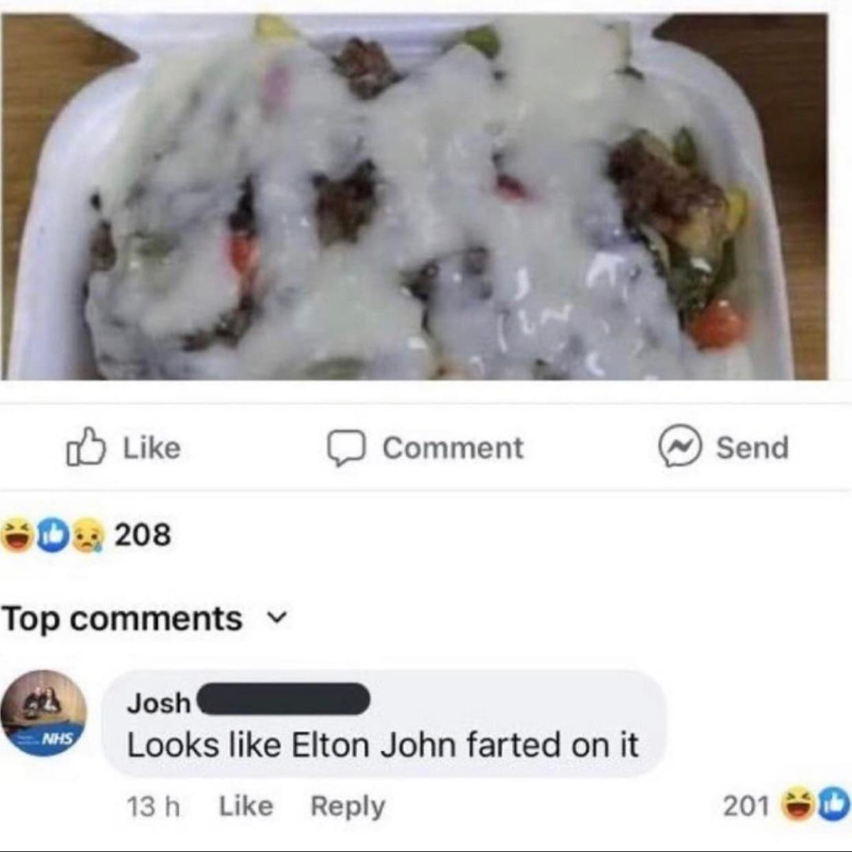 it's because he's gay, the original joke was "looks like elton john farted on it" but it has evolved into just being elton john destroying people's scran