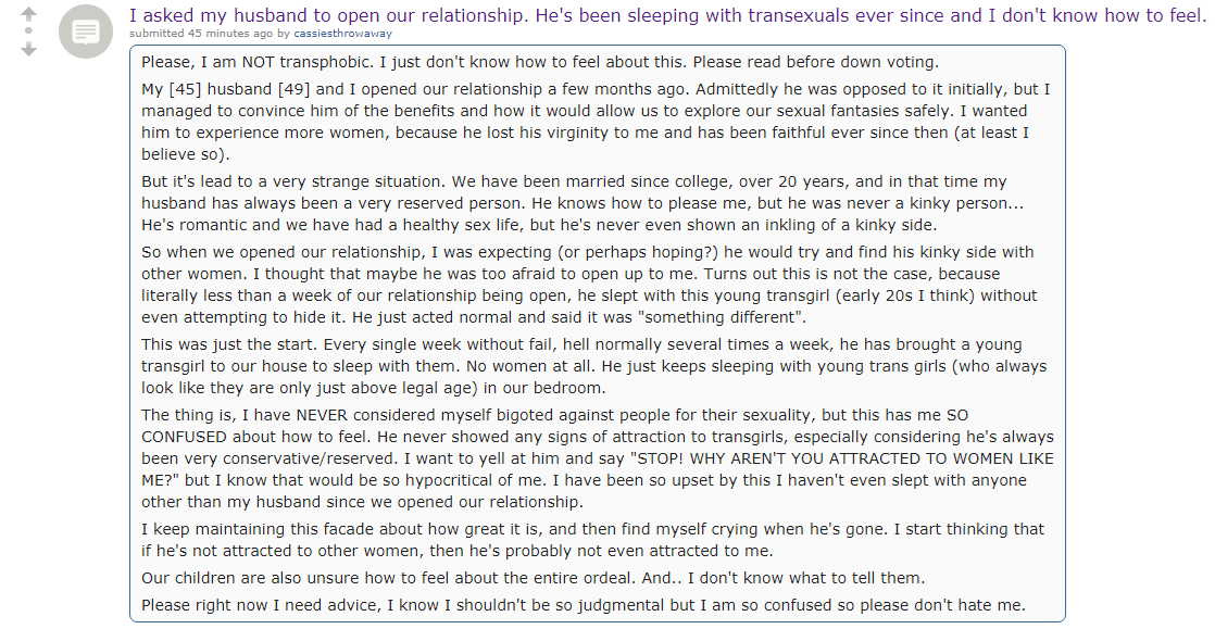 >>219114773100% fake (and gay), but what a fucking subhuman whore of a wife. She opens the relationship hoping to be passed around by Chad and when she doesn't get any action, she starts seething uncontrollably because her husband CANNOT stop making love to beautiful and young trans princesses. You don't need to explain anything to your children, they are all thinking "WAOW DAD, BASED!!!" and how much of a disgusting stinking hole with legs and arms you are. They all knew your true intentions and now they cannot stop laughing at you.But yeah, unfortunately this is simply ragebait.