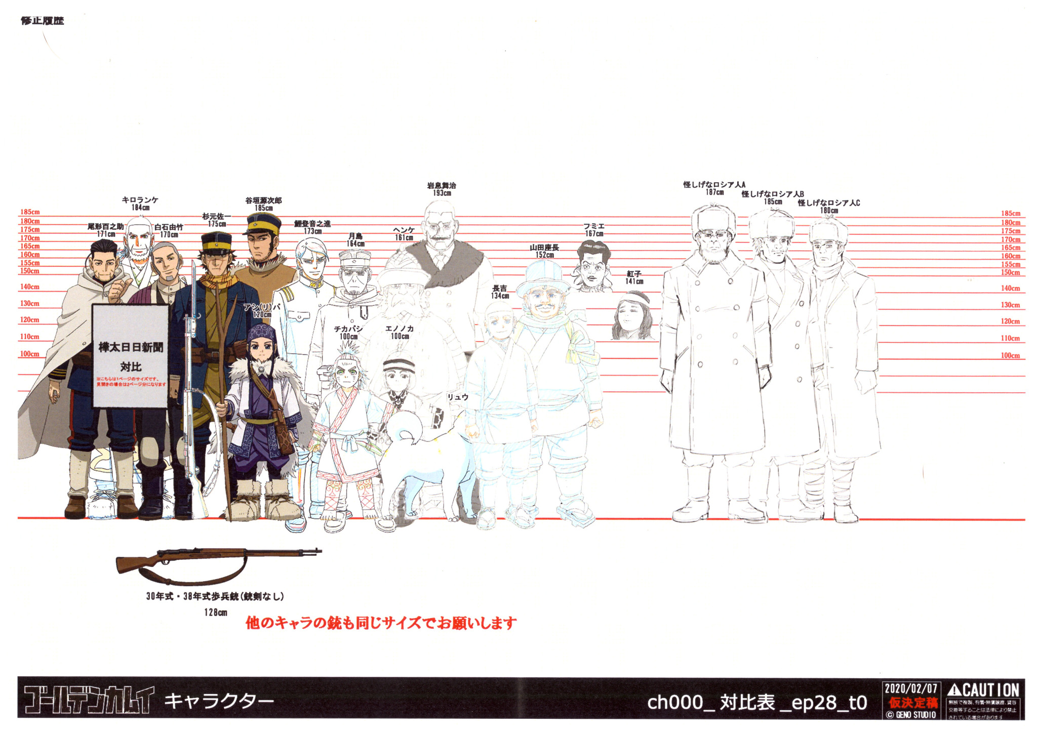 Golden Kamuy niitä harvoja sarjoja jossa hahmot oikean kokoisia. Venäläiset yli 180cm kaikki ja japsi miehet 170-180 väliltä.