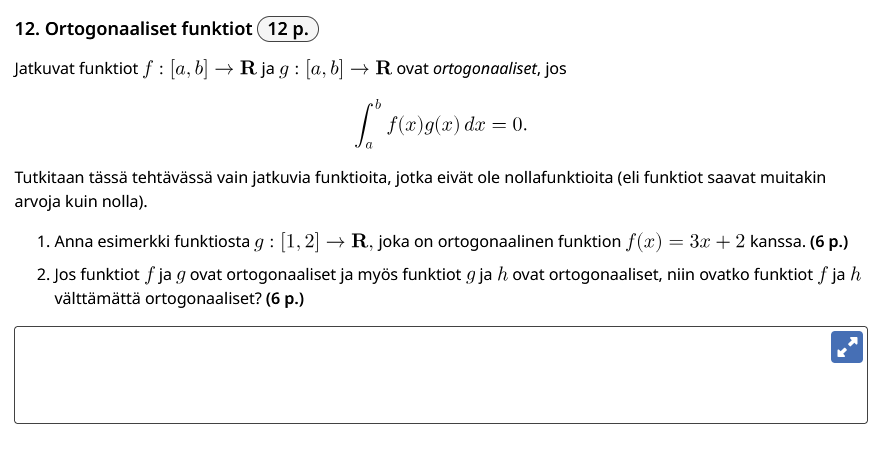 Kävin nyt ottamassa kuvan uusimmasta pitkän matematiikan yo kokeesta koska olen edelleen provosoitunut että tämä on muka matematiikkaa. Matematiikkaa on se montako omenaa litraa mehua matin pulloon mahtuu, ei tämmöstä.Miten joku voi katsoa tätä vakavalla naamalla ja väittää että tässä lasketaan jotain.