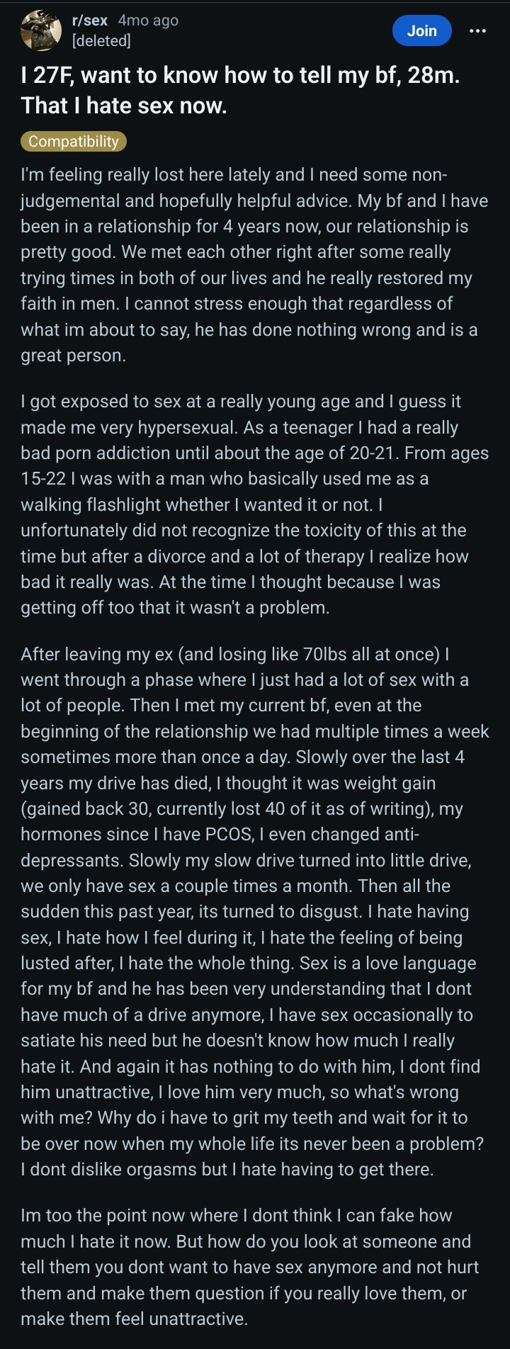 >Gets stuck on the high setting alpha dark triad abusive Chad>Settles for Betabuxx hoping she'll get over Chad>She still craves Chad and just cannot stomach Betabuxx oofy doofy>"Why do i have to grit my teeth and wait for it to be over now when my whole life its never been a problem?">"From ages 15-22 I was with a man who basically used me as a walking flashlight whether I wanted it or not. I unfortunately did not recognize the toxicity of this at the time."Fresh blackpill just dropped and I've barely read 10 posts on that shithole. Grim.