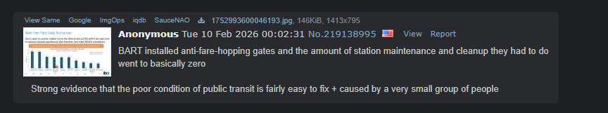 >BART installed gates that prevented fare-hopping and maintenance dropped by 98%.wow, now if we just applied the same principle to our nation as a whole!