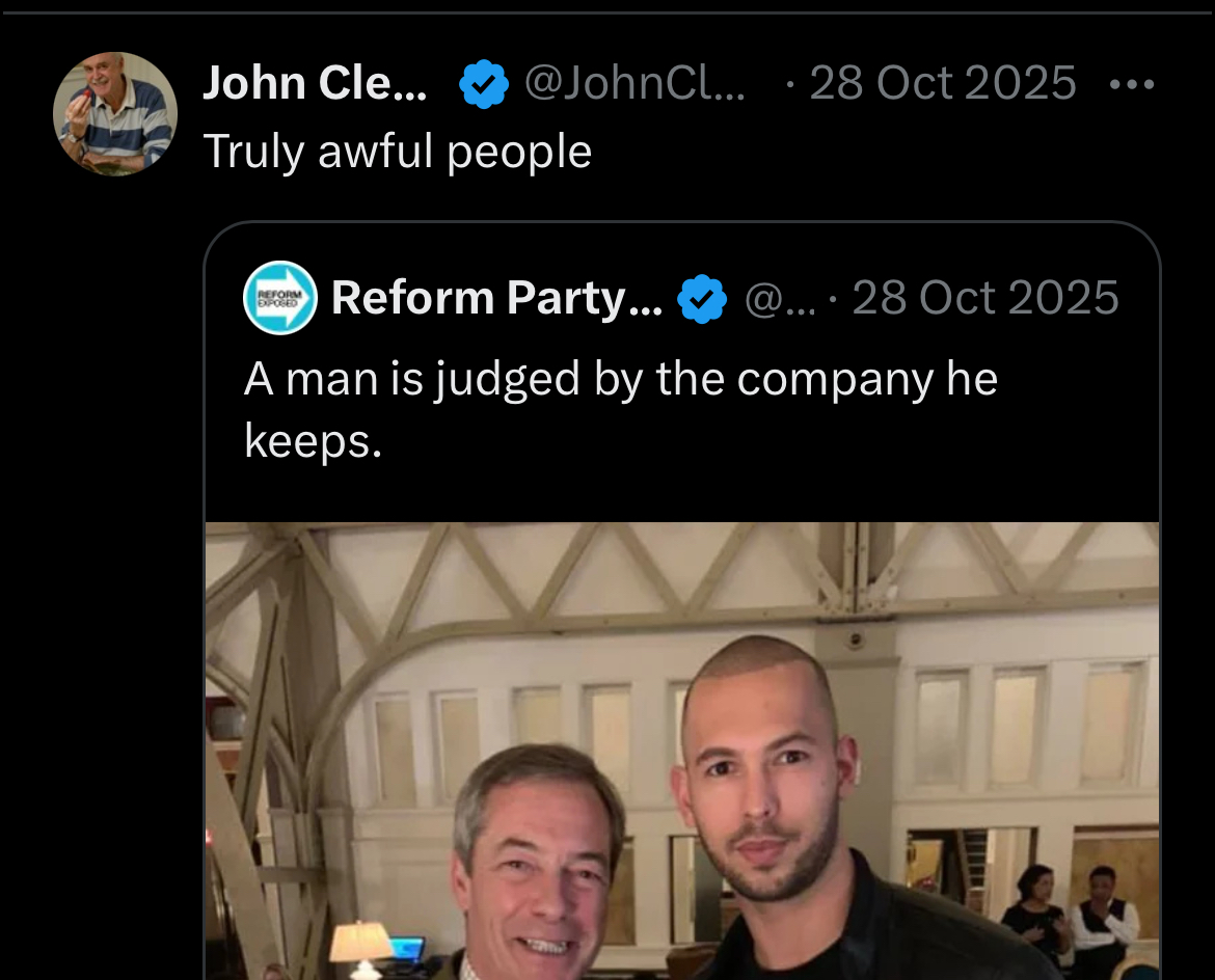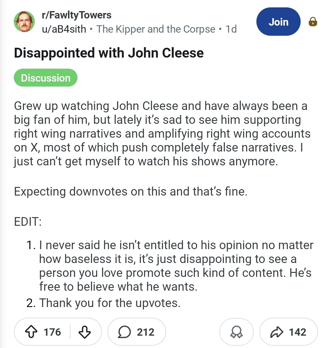 John Cleese was a Liberal Democrat in the 1980s. He didn't move from his position, SOCIETY moved from HIM because of WOKE