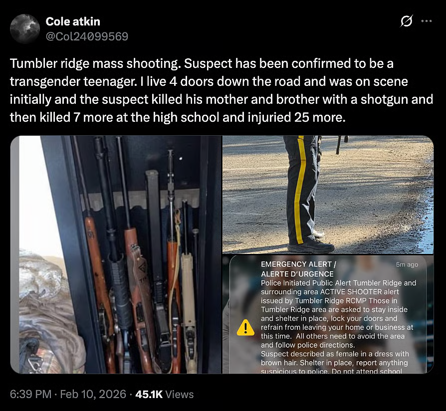 https://www.theguardian.com/world/live/2026/feb/11/tumbler-ridge-school-shooting-live-updates-number-dead-suspect-deceased>Asked why the police haven’t identified the suspect as being transgender, McDonald says police have identified the suspect as “they chose to be identified in public and in social media”.Stop validating this delusion. It's not compassionate