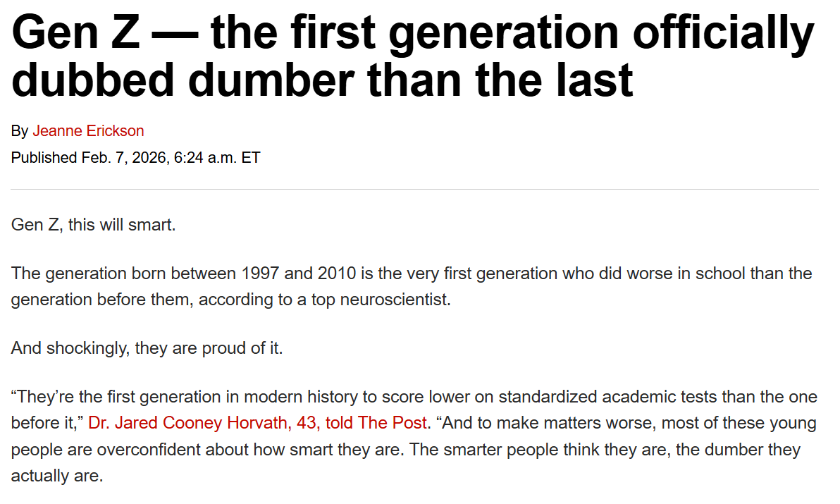 Neuroscientist Jared Horvath said Generation Z--those born roughly between 1997 and 2012-is the first generation to underperform across every cognitive measure. “They underperformed on basically every cognitive measure, from basic attention, memory, literacy, numeracy, executive function and general IQ.”