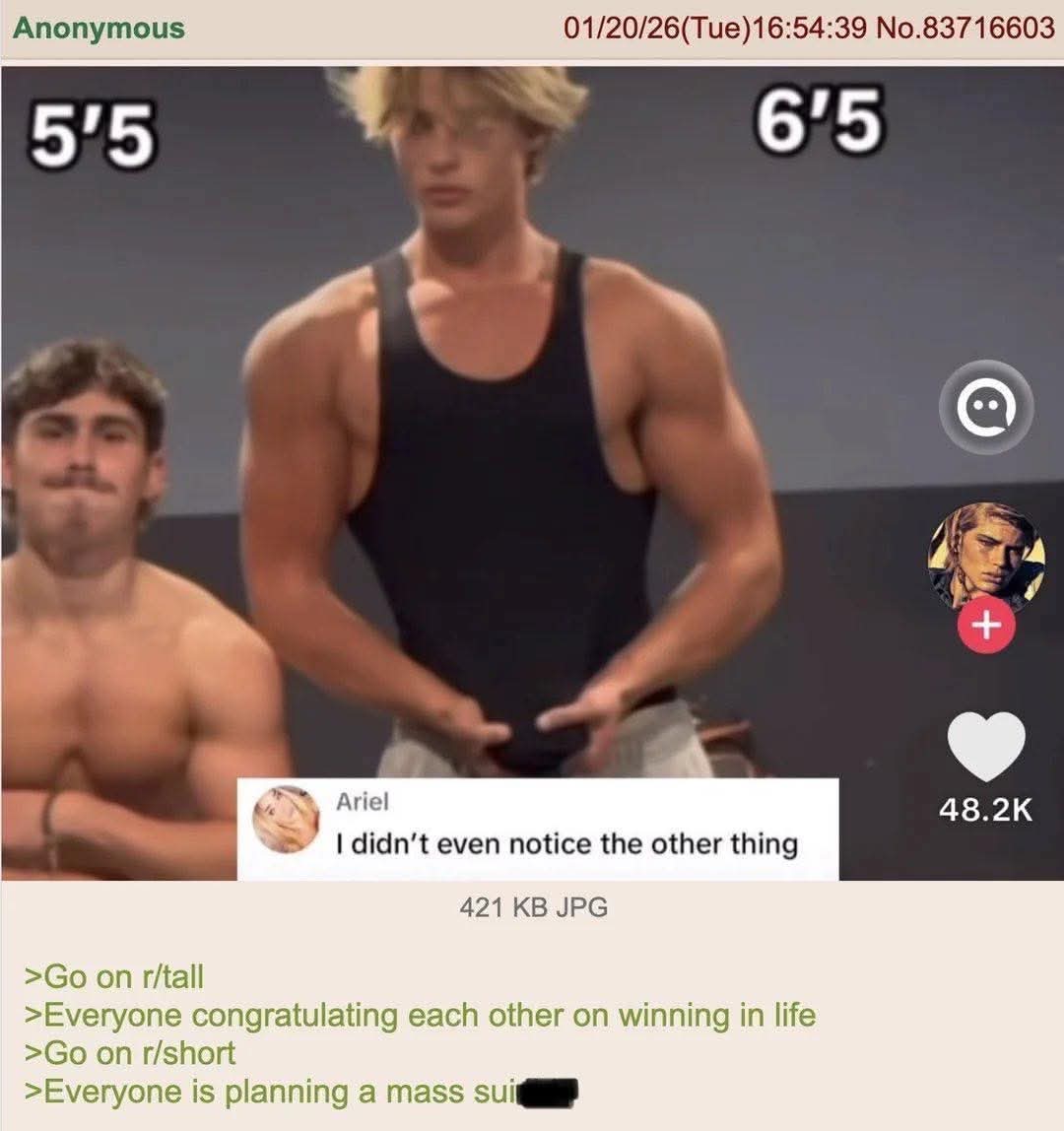 >>219202607To nisam ja baki>>219202422Bukvalno ne znam zato zivim, odoh malopre do prodavnice i mrsava kasirka ni da me pogleda, dzaba treniram kad mi je lice ruzno