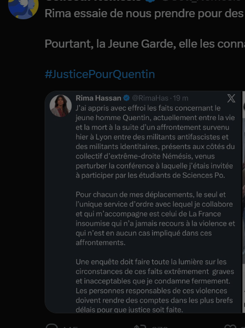 Tout mon soutien au Collectif Némésis et j’espère que le membre de la sécurité va s’en sortir. A toutes les gauchiasses qui rigolent de ce drame: vous avez ma haine.