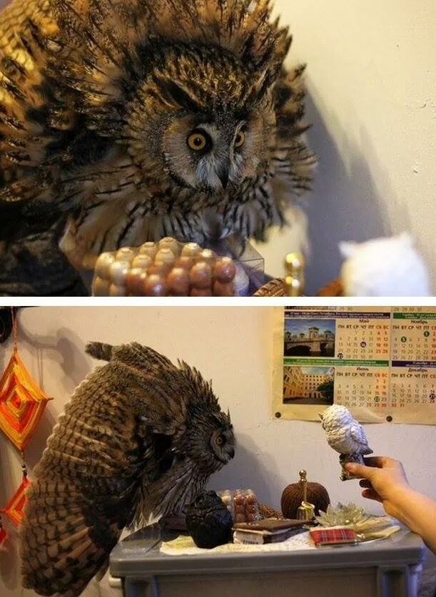 We've got an owl in the village that hangs out in the back garden at night hooing and wooing so much that my african grey has started hooing and wooing tooMight invite him in next time I see him