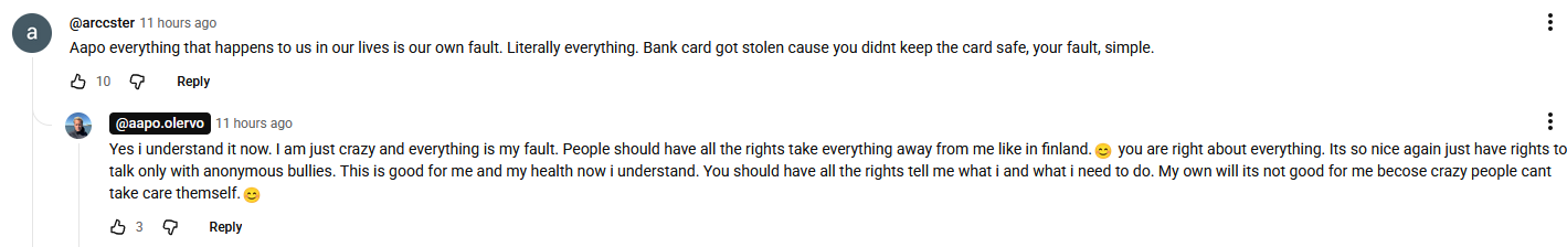 Nyymi puhu yöllä tai aamulla en muista mutta kuitenkin Hannu Karposta, eksyin tänne kanavalle niin 99% ajastahan tämä tosiaan on ollut oikeuden perässä. Hurjaa ajatella millaista riistoa ihmiset ovat aivan lainvastaisesti kärsineet ja jotkut tapaukset päättyvät siihen että valtio tai joku muu iso jehu taho mediahuomiosta huolimatta vaan on sillee nocando.sPahin esimerkki mitä tähän mennessä on tullut vastaan on se kun valtio hakkasi miehen metsät, tarjosi 10% arvosta korvauksena ja kun se ei kelvannut mies hävisi hovissa. Suomi vaan päätti että et sinä ole oikeutettu edes saamaan rahallista korvausta tästä, mutta sata tonnia juristikuluja on tässä ole hyvä. Ukko ei kirjaimellisesti ollut tehnyt muuta kuin halunnut rahansa takaisin.