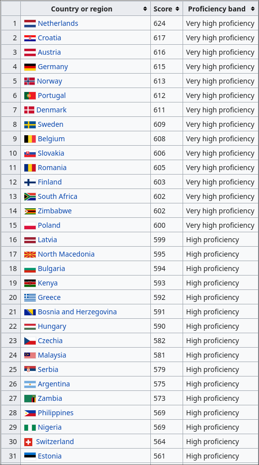 >Below are the latest country scores, proficiency bands, and rankings as published in 2025. Singapore, which had long ranked highly and was frequently the top performer in Asia in earlier editions, was excluded from the index since 2025 after being re-classified as a native English-speaking country.