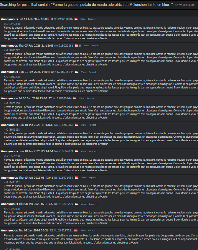 >>219263405Je me branle de ce que tu penses. Tu as laissé ta nation tomber sous le joug d'envahisseurs djihadistes pour une retraite et 40k€ nets par an. Tant que tu n'auras pas réglé ce problème, je n'aurai aucun respect pour toi. Discuter avec 90% des français est une perte de temps. Ils sont profondément démoralisés. La soumission intergénérationnelle les a complètement vidés de toute volonté se défendre. On leur inculque qu'ils doivent prendre soin de chaque étranger, et beaucoup s'y soumettent. Les français sont élevés dans un nihilisme autodestructeur dès leur plus jeune âge, et le fruit de ce désespoir est l'effondrement spirituel total de leur nation.La France est en train de devenir un pays satellite de l'Afrique et du Moyen-Orient. Il n'y a aucune assimilation visible, ni même la moindre tentative. Les français ne sont que les chiens des musulmans, qui se sont imposés comme la classe dirigeante en France, ils y vivent, mais ne sont soumis ni à ses lois ni à ses valeurs, tandis que les français de souche existent pour les servir et doivent satisfaire le moindre de leurs caprices.Un musulman peut massacrer des dizaines de français. Et quel est leur instinct ? Pleurer leurs frères et sœurs morts ? Désirer vengeance ? S'assurer que cela ne se reproduise plus en les expulsant ? Non. Lorsqu'un attentat se produit, les français pleurent en pensant aux représailles contre les musulmans : « Oh, cet attentat va rendre l'extrême droite plus populaire ! » Pendant ce temps, ils se rassurent en se disant que nous sommes tous humains, tandis que les musulmans se moquent d'eux, les traitant de faibles et de lâches, et profitent ouvertement de leur faiblesse, saignant fièrement la France à blanc.C'est comme si tu voulais disparaître. Tu te détestes plus que tout au monde. Un pays de lâches inutiles et aigris qui se croient supérieurs au reste parce qu'ils se soucient de leurs « droits de l'homme » (mdr).