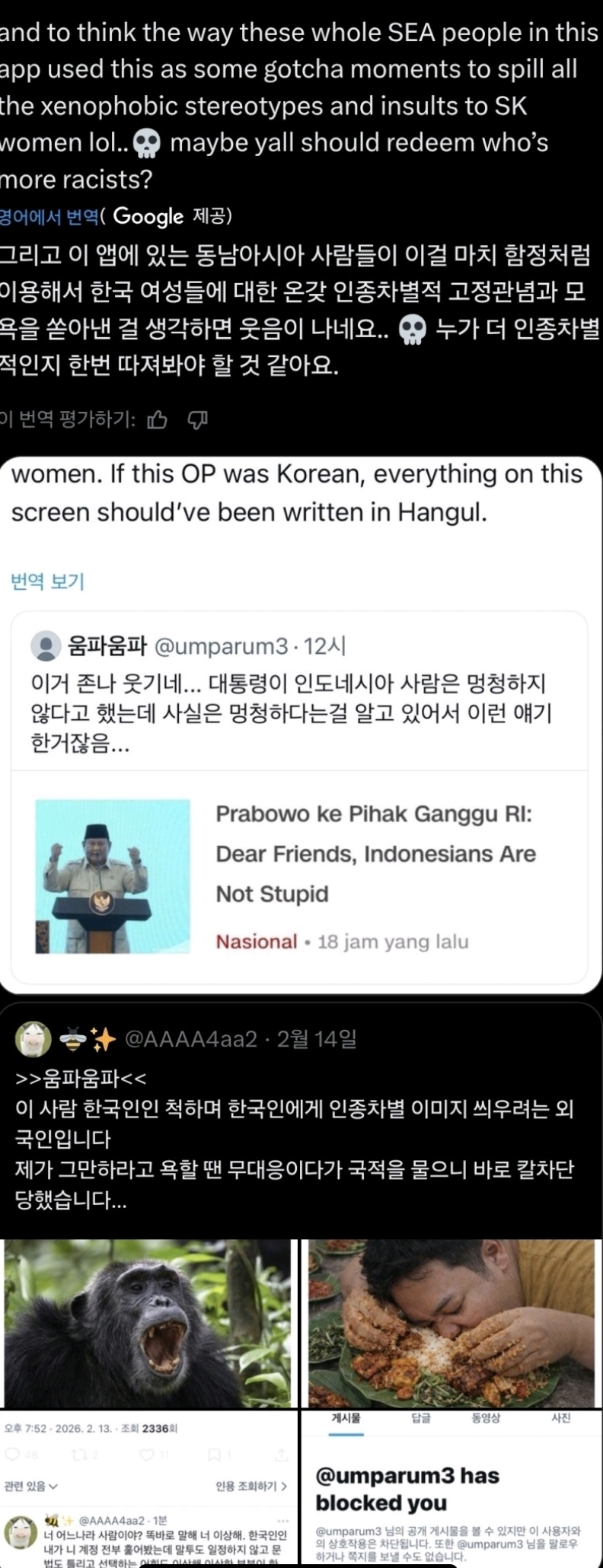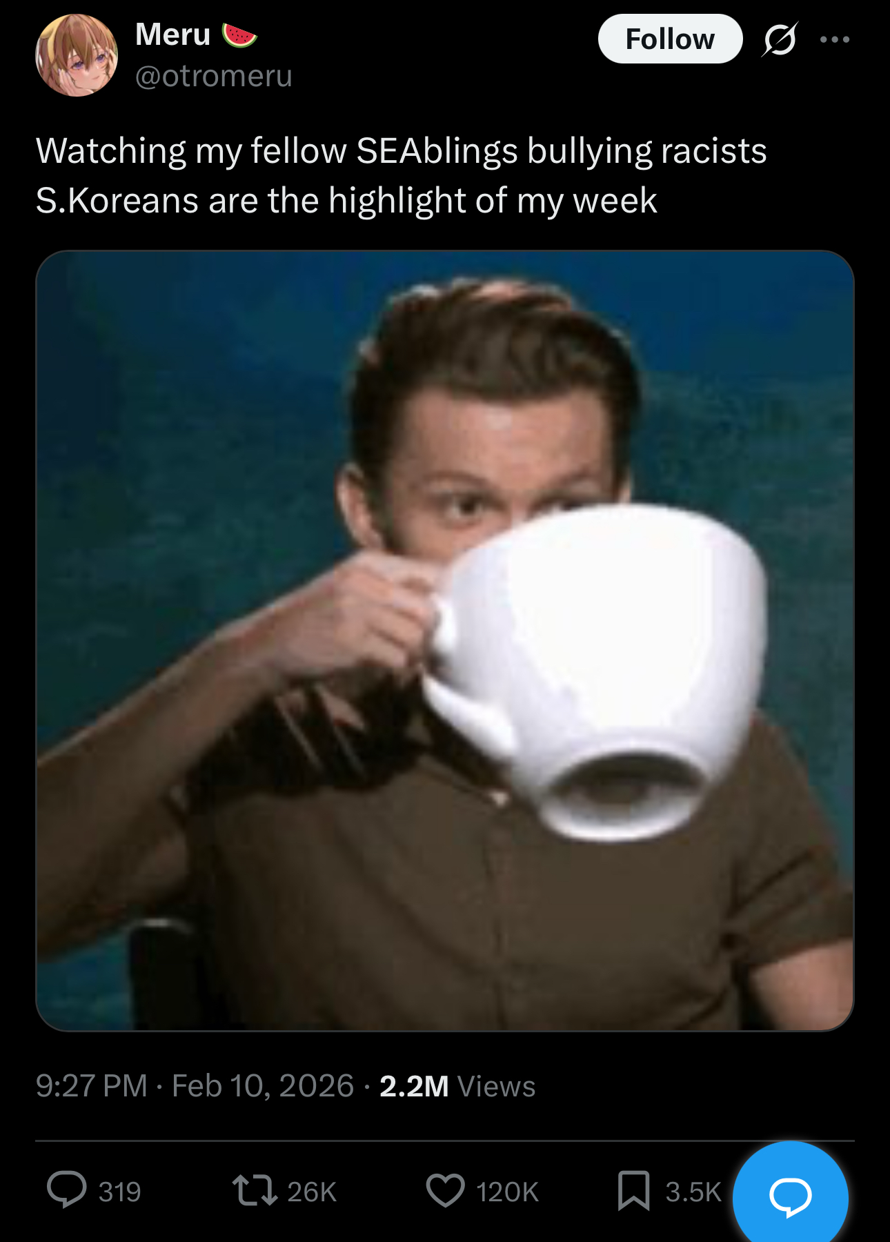 Recently South korea and SEA are shtting on each other at twitterHonestly i have no idea what's the point of arguing in that shithole, twitter was never relevant in history of internet and idiots are wasting time in arguing there,