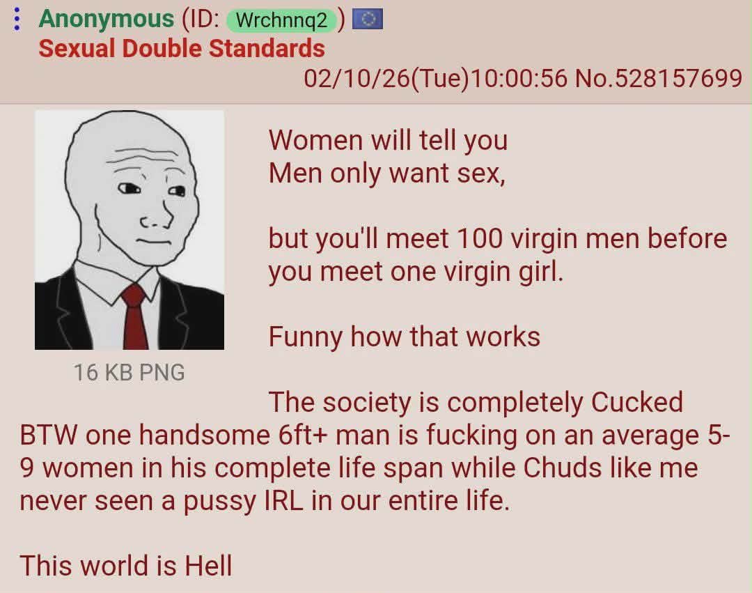 >>219270847Men in general has zero standards and will fuck the first woman who gives them the chance. Then post nut clarity hits and they realize it isn’t worth it. Incels aren’t immune to this, you just haven’t experienced it. Your attraction to most women take a nose dive the moment you’ve slept with her. We absolutely think only about sex. The moment you actually do manage to score some 5/10 fugly chick who you really aren’t that into, you will experience this first hand and start working your butt off to get better options