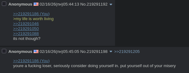 >>219291186>my life is worth living>>219291046>>219291050>>219291088its not though?