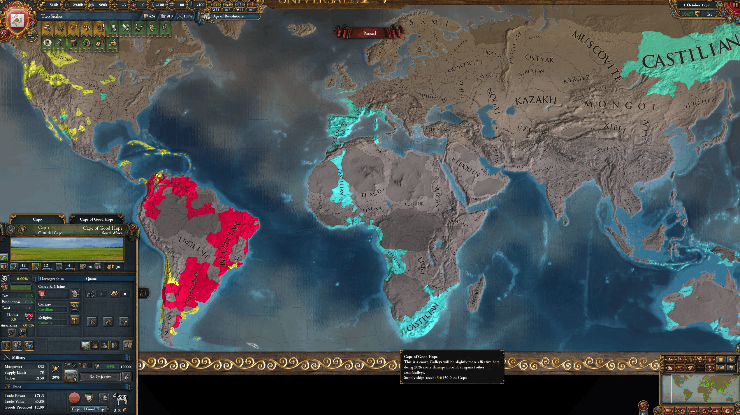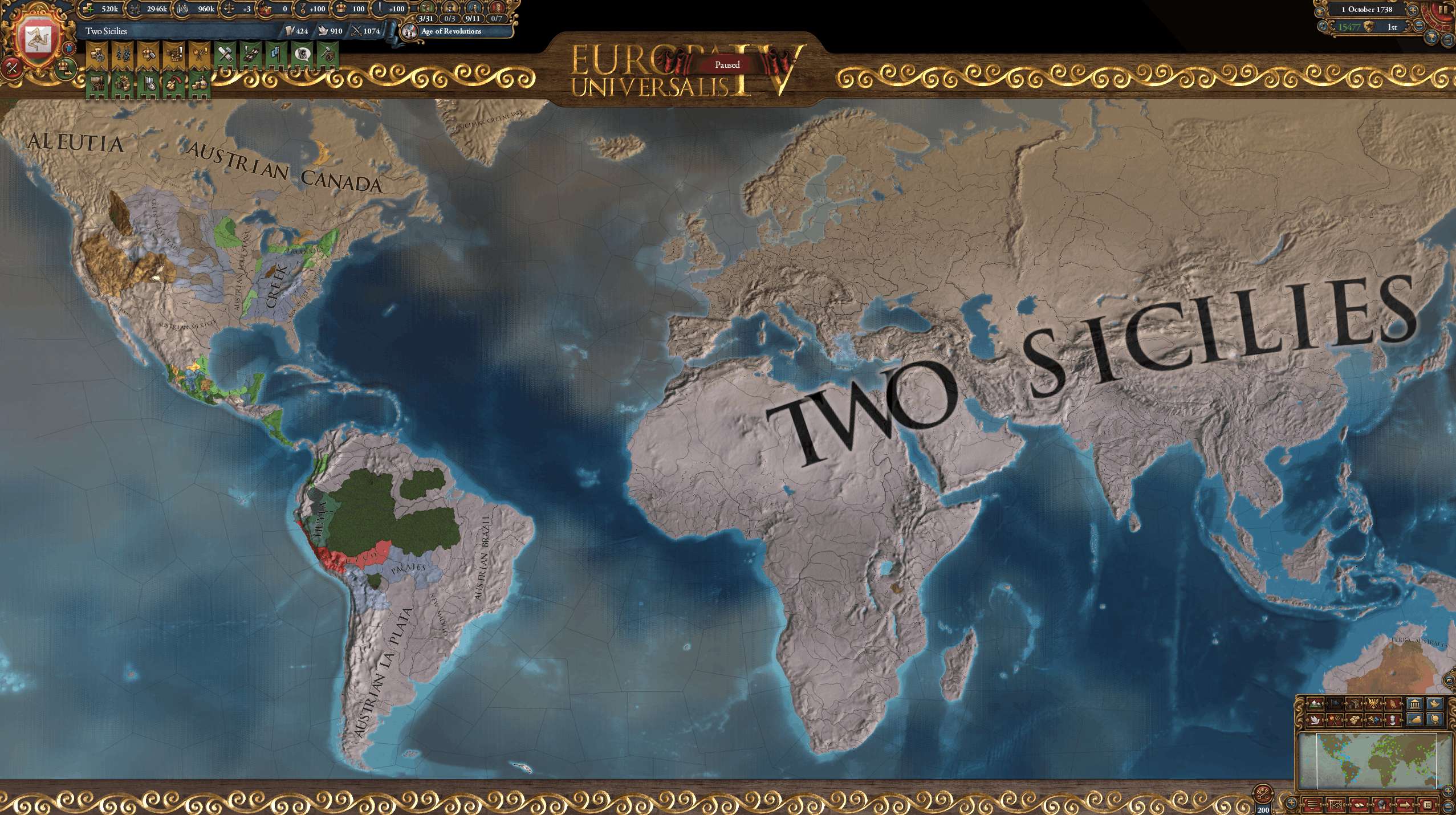 How's your game going /int/? For me the goal is one culture. I've done it once before as Austria. I've conquered the entire old world except Kyoto which I am using as a mana farm. My capital is still in the old world because I wanted to keep changing tags. I dont want to form Rome because thats what I did last time and wanted to make the challenge harder.All I've gotta do now is devour the new world and convert the provinces. Do I have enough time? I have austrian government form and have converted what amounts to iberia and france.