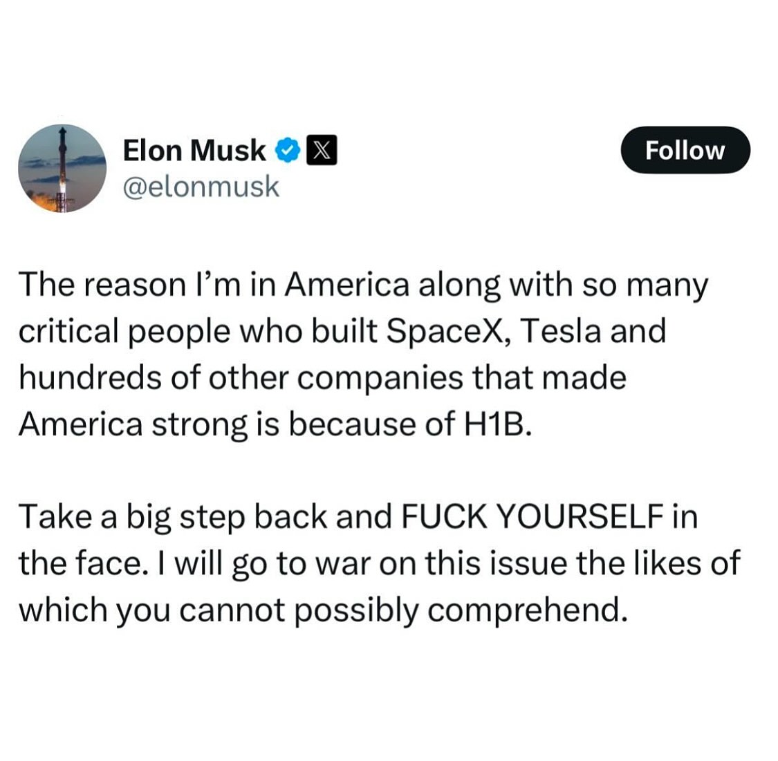 >>219299952Him saying this to millions of people makes him a hero to me no matter how many H1B jeets he hires. Thank you, and God Bless Elon.