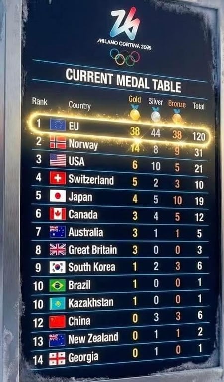 This is retarded because actual countries have a limit for how many of their athletes can take part in an event. You can't combine the medals from all EU countries with that in mind