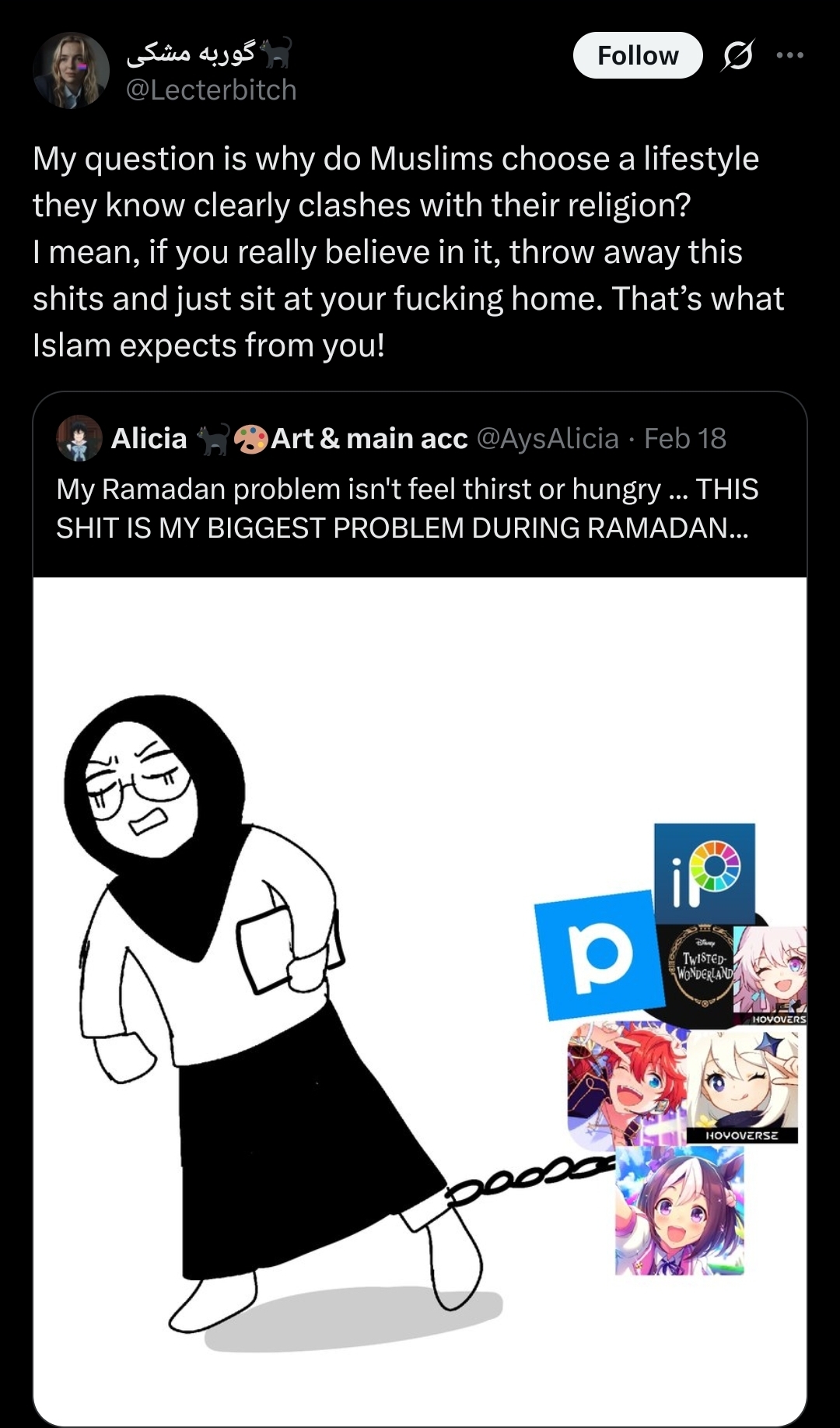 >>219396743Muslim weebery is a very strange thing to me. Like black weebs I get, but Anime seems fairly at odds with islamic teachings.